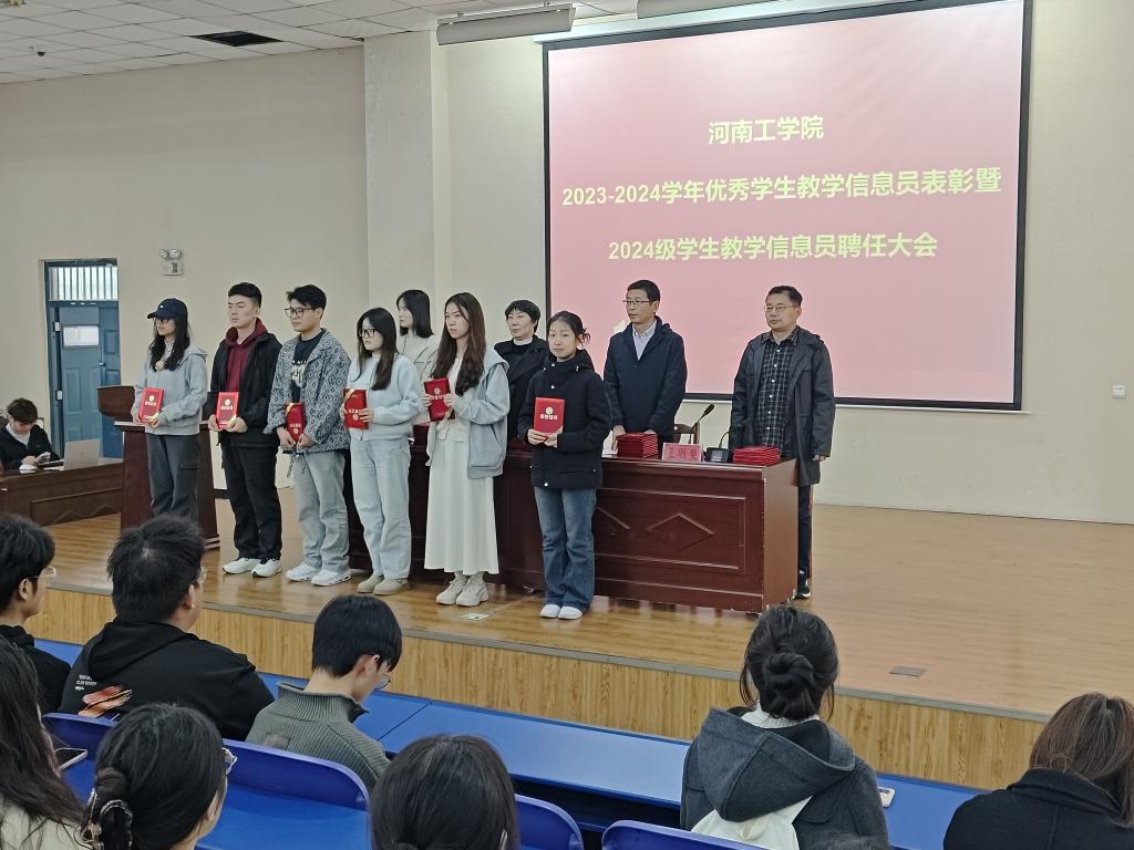 大会在国歌声中拉开序幕。会上,杨保海宣读了《关于表彰2023-2024学年河南工学院优秀学生教学信息员的决定》,王明斐宣读了《关于聘任2024级学生教学信息员的决定》。与会老师为荣获“优秀学生教学信息员”荣誉称号的90名学生颁发了荣誉证书,2024级学生教学信息员领取了聘任证书。