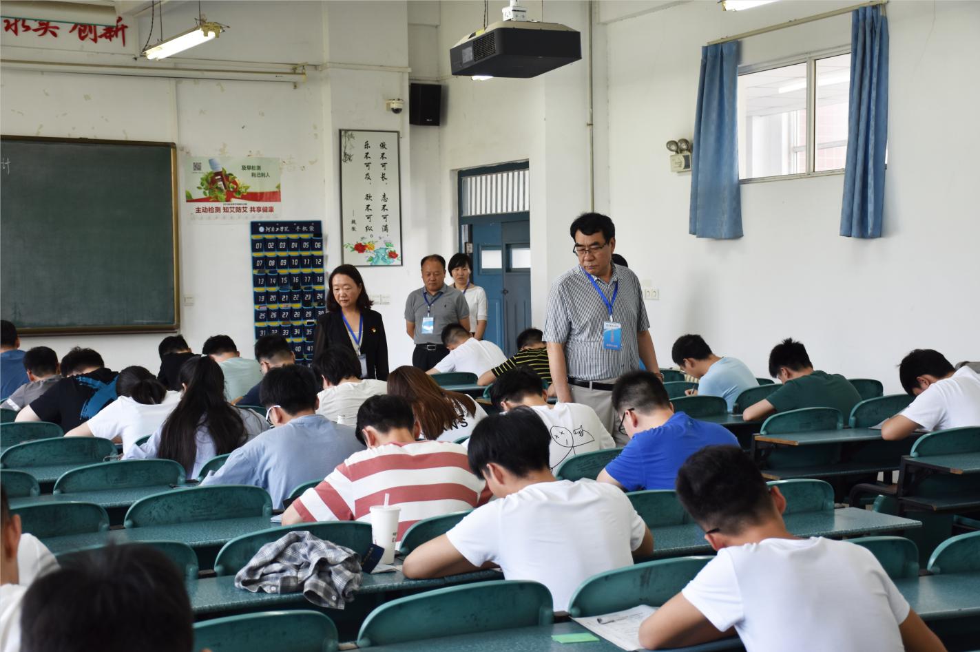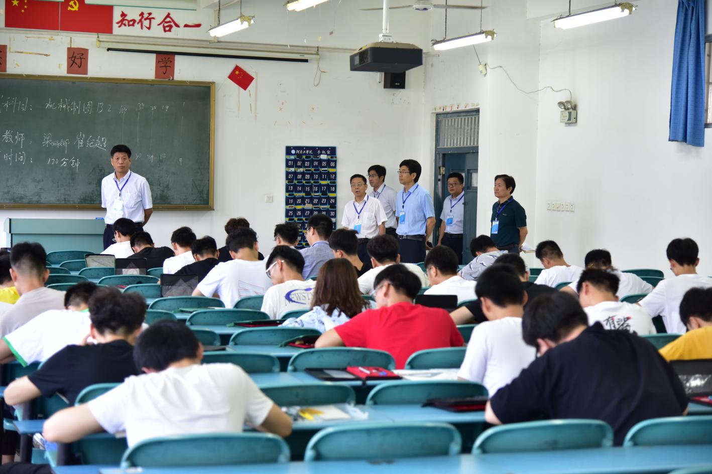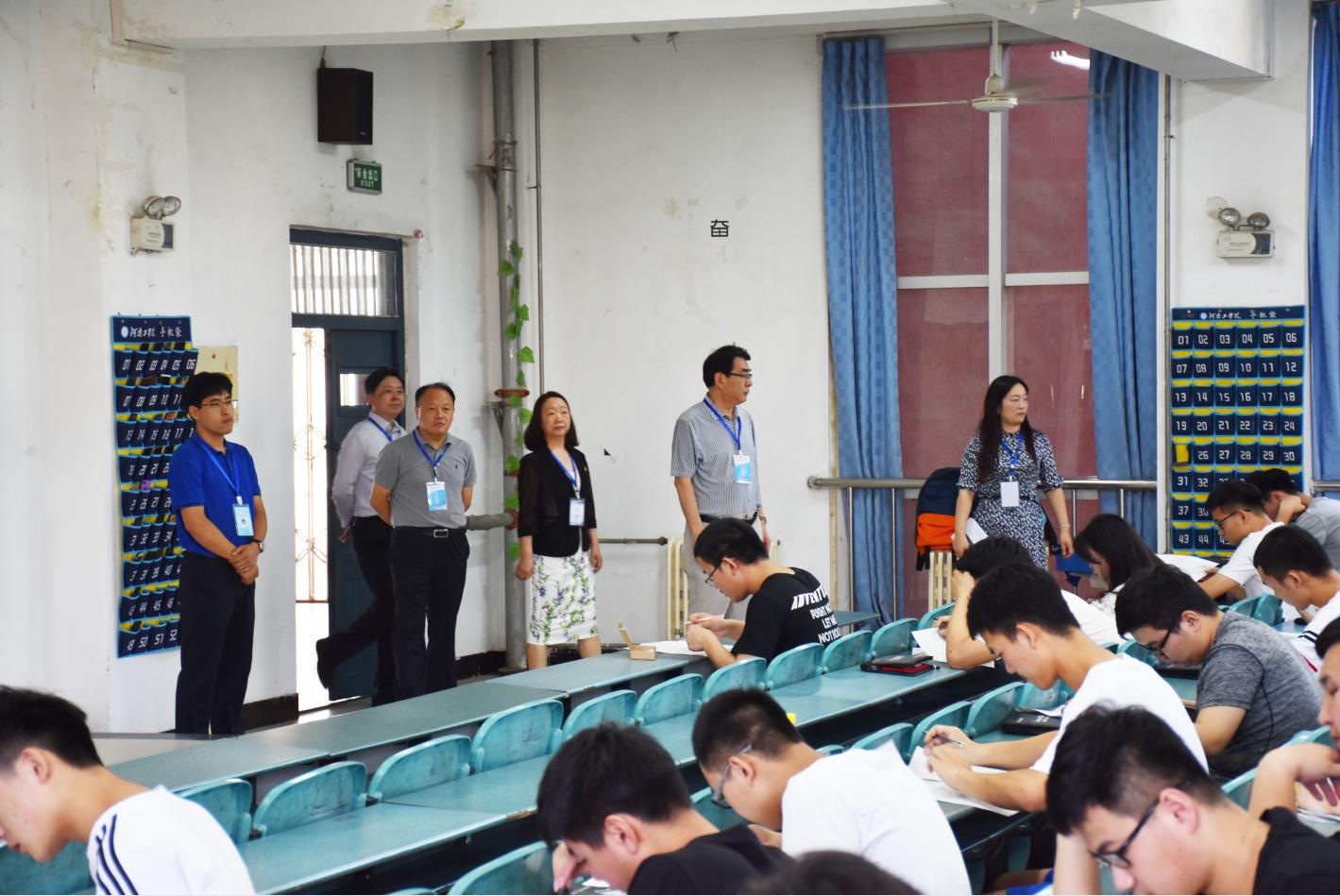 7月1日上午,我校2018-2019学年第二学期期末考试全面展开,校党委书记赵学通,校长陈丙义,党委副书记李贵敏,副校长刘莉莉、戚新波、张国臣,校纪委书记樊羁光以及党办、校办、教学质量监控与评估中心、教务处、学生处、团委、后勤处等相关职能部门负责人分成两组,深入考场进行了期末考试巡视。