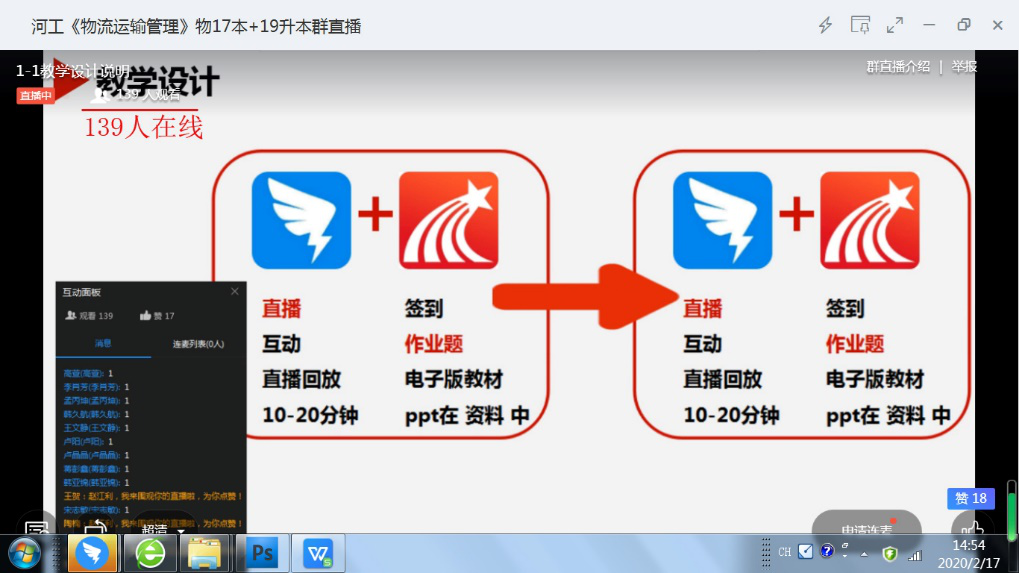正式实施网上教学的第一天,任课教师在前期充分教学准备的基础上,通过学习通、慕课堂、雨课堂等平台发布教学资源、开展教学活动,并辅助使用钉钉、腾讯会议、微信、QQ等工具,进行互动式教学,学生学习积极性高涨。网上教学首日,教师开课率100%,学生到课率98%,教学资源访问量9493次,教学互动十几万人次,师生对在线授课及教学效果反应良好。